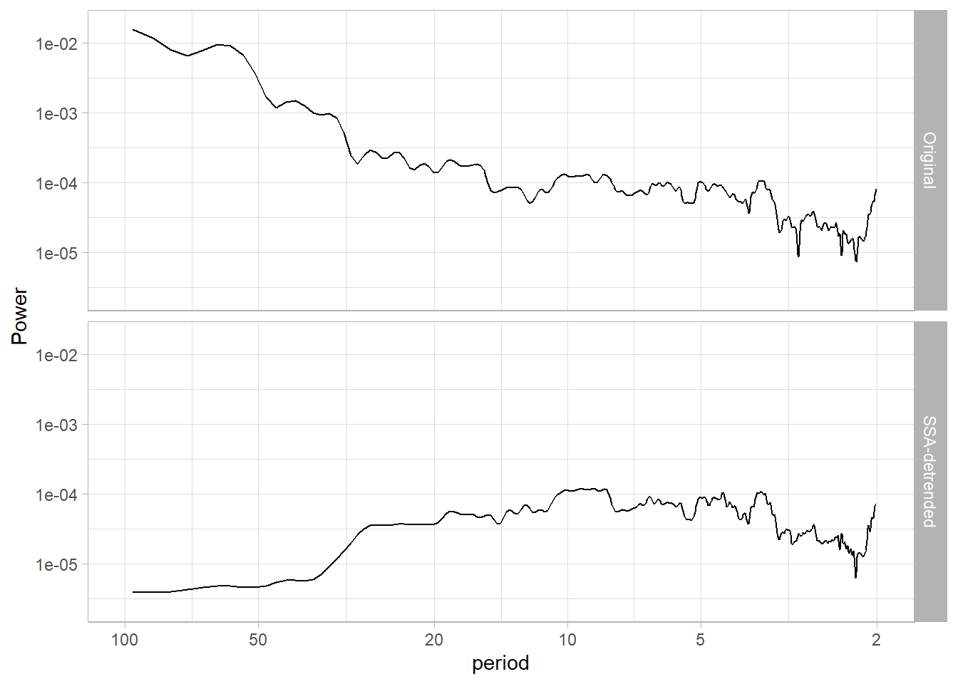This pre-processing allows us to better isolate oscillatory behavior. To see this, let’s look at the spectra of the original and detrended versions: