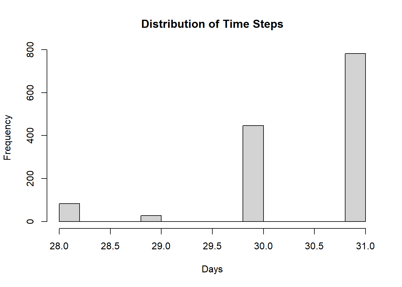 hist(as.numeric(diff(df3$Date)),main = "Distribution of Time Steps", xlab = "Days")