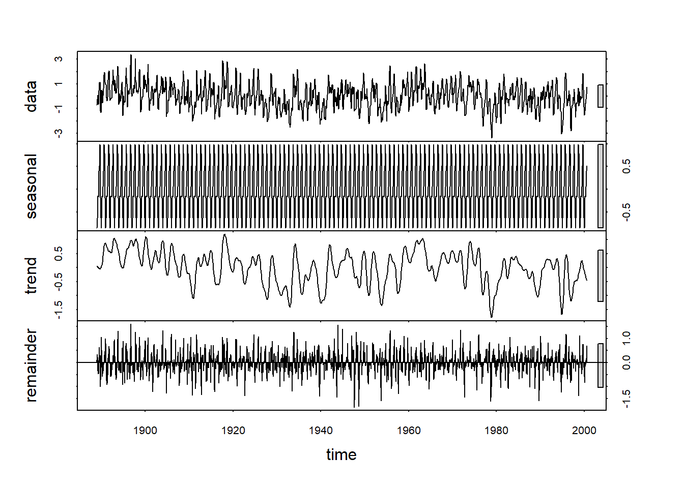 Now, because of the positive skew mentioned above, it turns out that the STL decomposition has trouble with this dataset. Instead, we can use the gaussianize() to map this dataset to a standard normal. There are applications for which this would be undesirable, but for this purpose it is good: