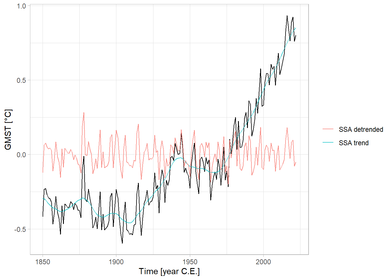 geom_line(aes(y = gmst_ssa_dtd$temp, color = "SSA detrended"), alpha = 0.8) +