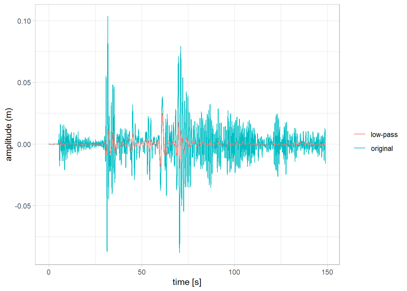 aes(x = time, y = ground_motion, color = 'low-pass')) +