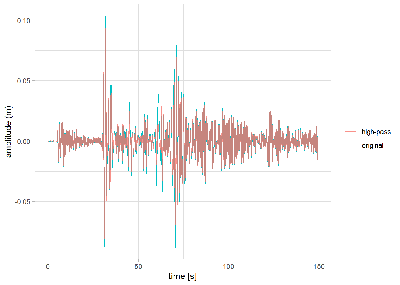 aes(x = time, y = ground_motion, color = 'high-pass'), alpha = 0.8) +