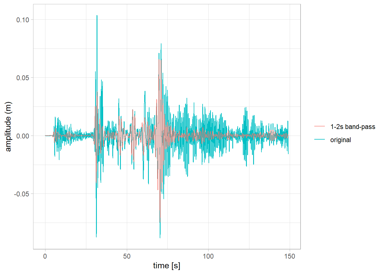 aes(x = time, y = ground_motion, color = '1-2s band-pass'), alpha = 0.8) +